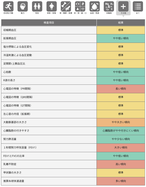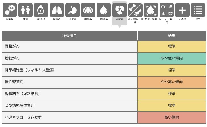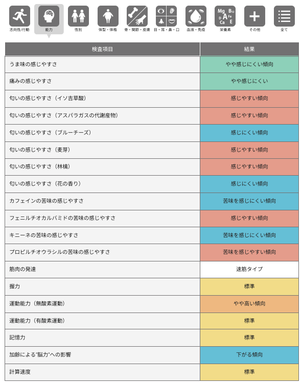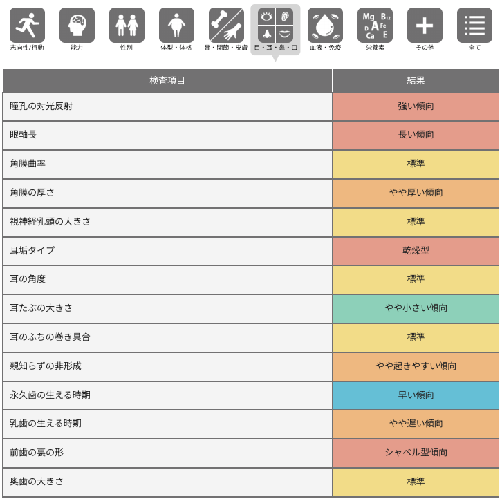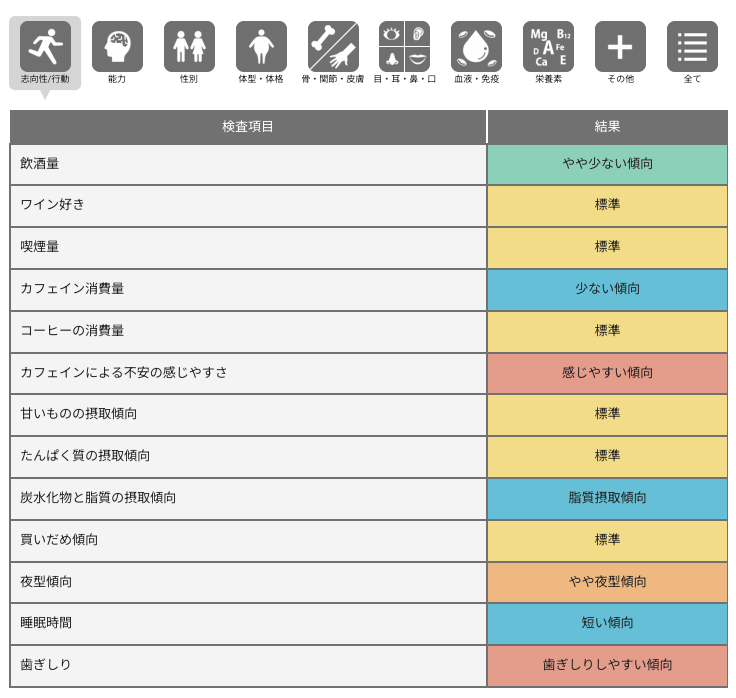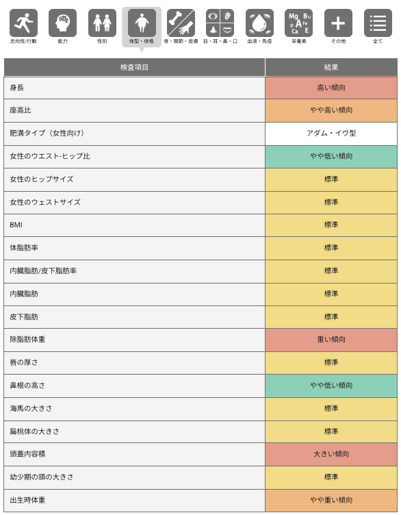 大きく分けてカテゴリは『体質・疾患(病気のなりやすさ)』が分かるよ。