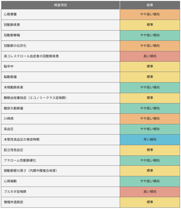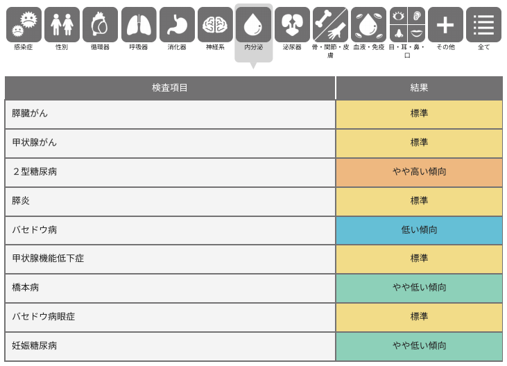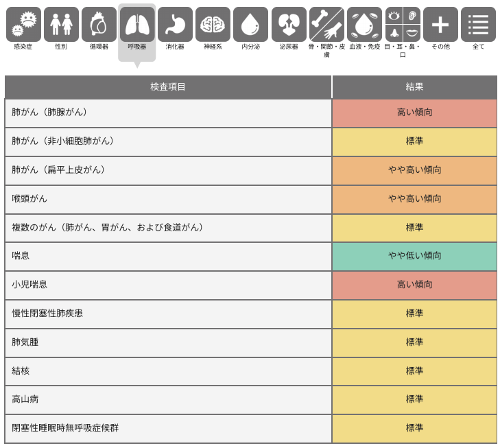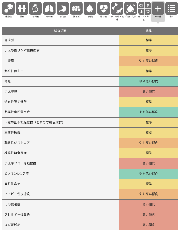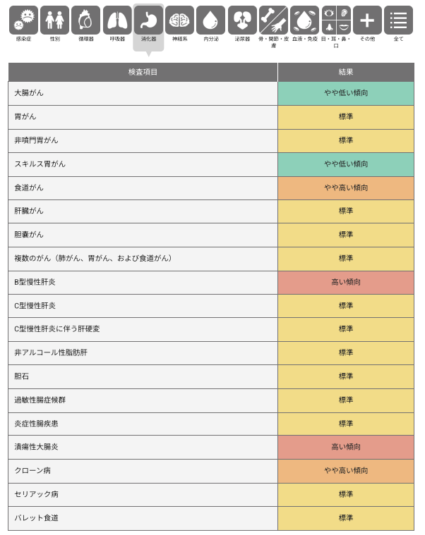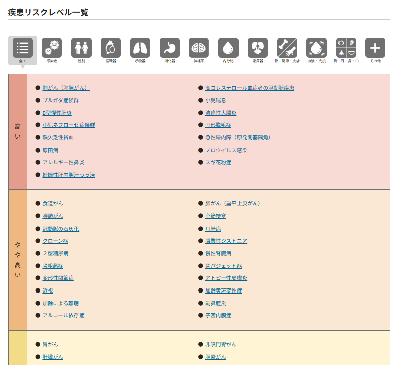 こんな感じでリスク高いに分類された疾患が見れるページもある!わかりやす~い。